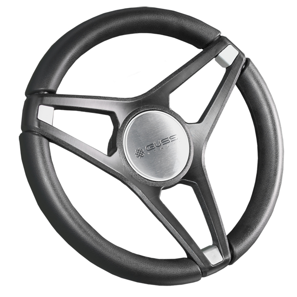 Gussi Molino all black polypropylene construction gives the steering wheel its strength while its brushed aluminum tips and centerpiece adds style.