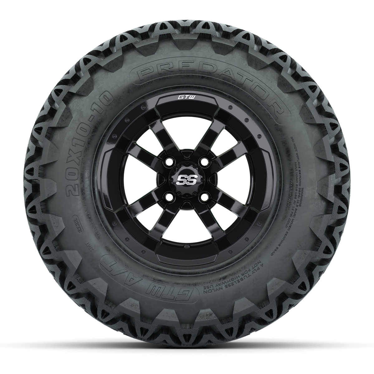 A set of (4) 10-inch Storm Trooper black lifted golf cart wheels on 20-inch A/T tires