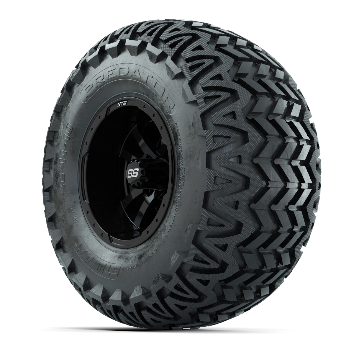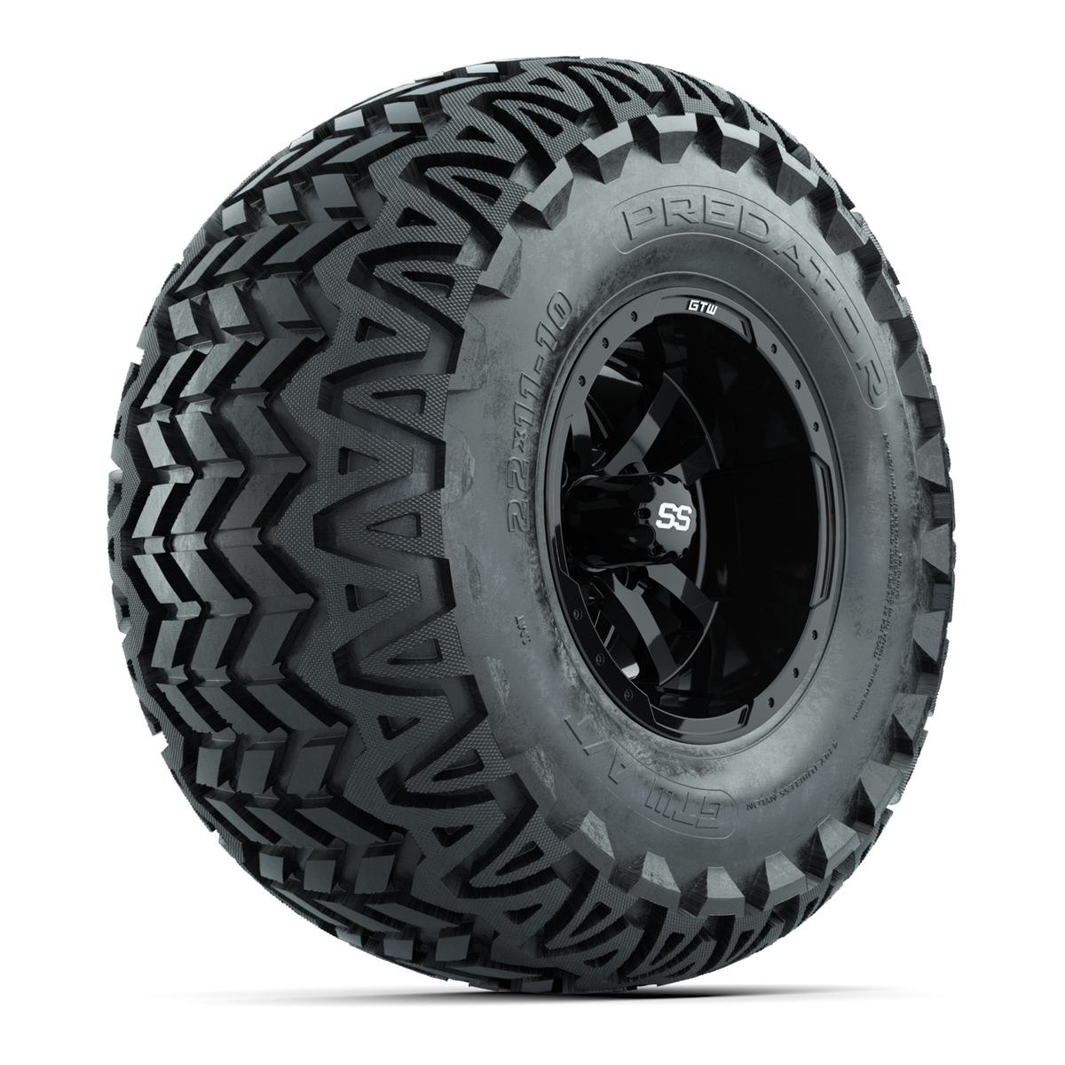A set of (4) 10-inch Storm Trooper black lifted golf cart wheels on 22-inch A/T tires