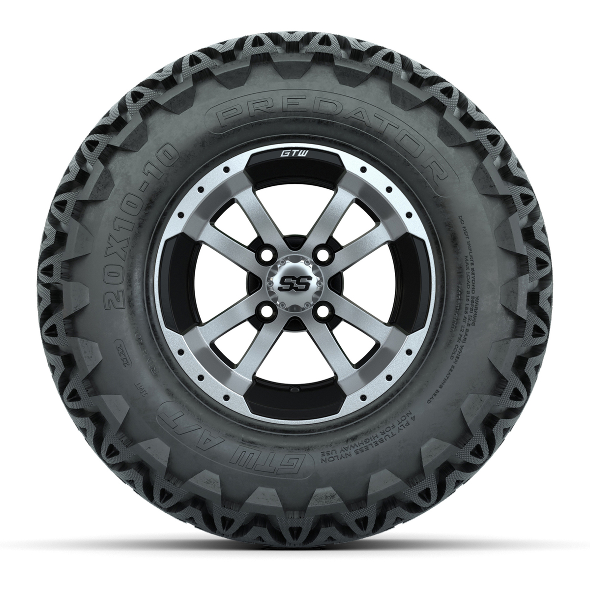 A set of (4) 10-inch Storm Trooper black/machined lifted golf cart wheels on 20-inch A/T tires