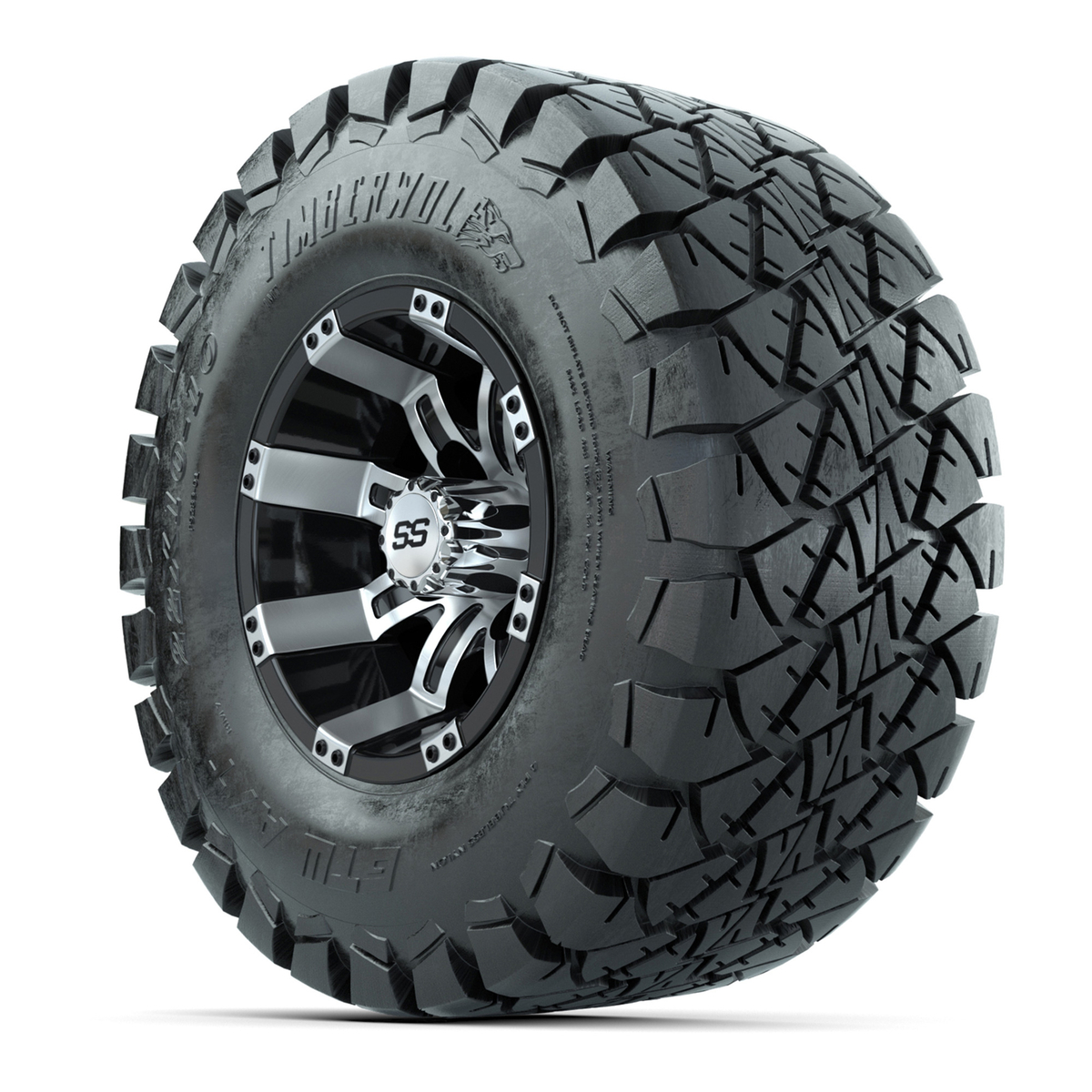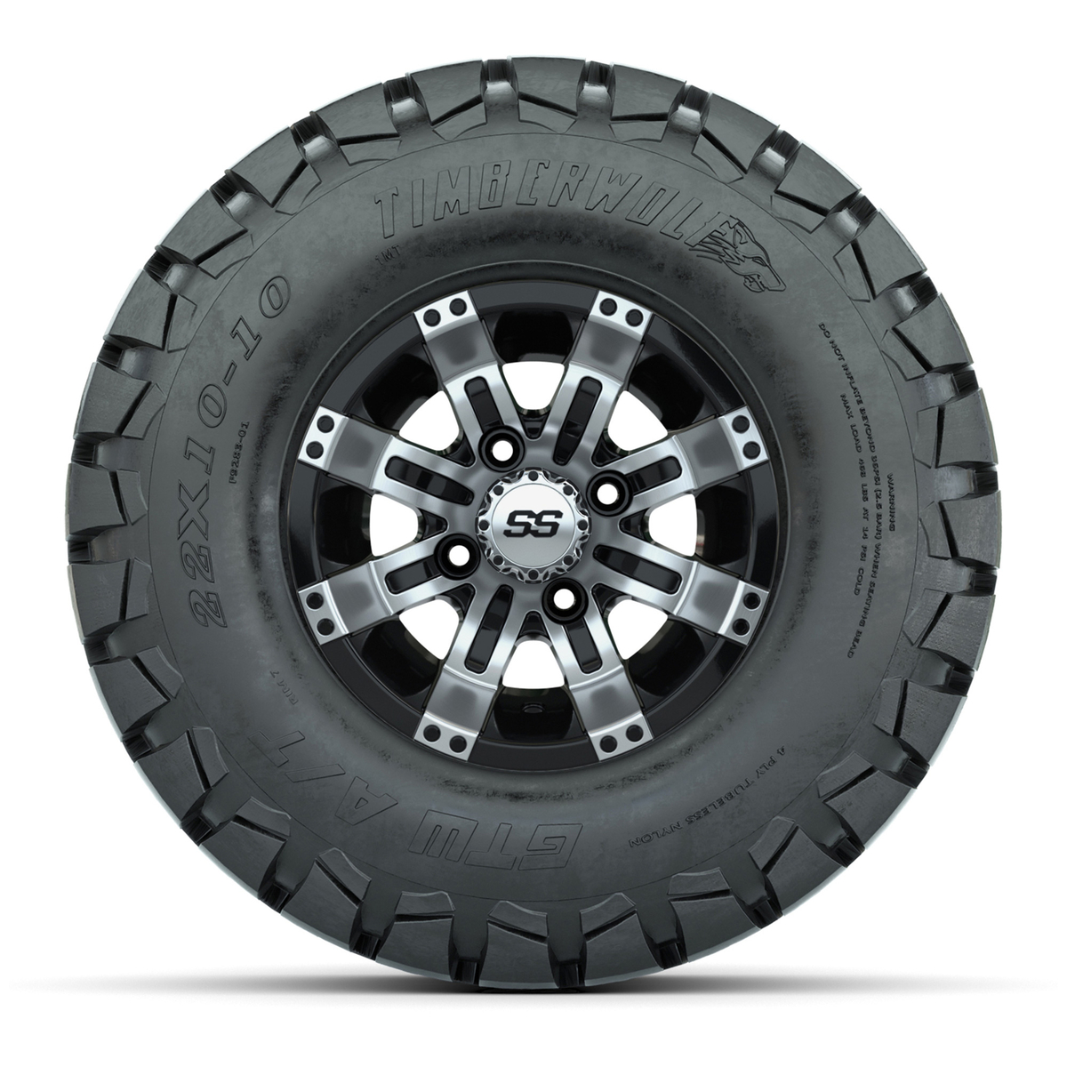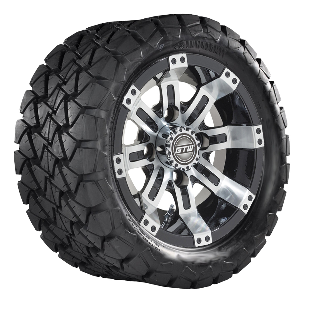 A set of (4) 10-inch Tempest black/machined lifted golf cart wheels on 22-inch trail tires