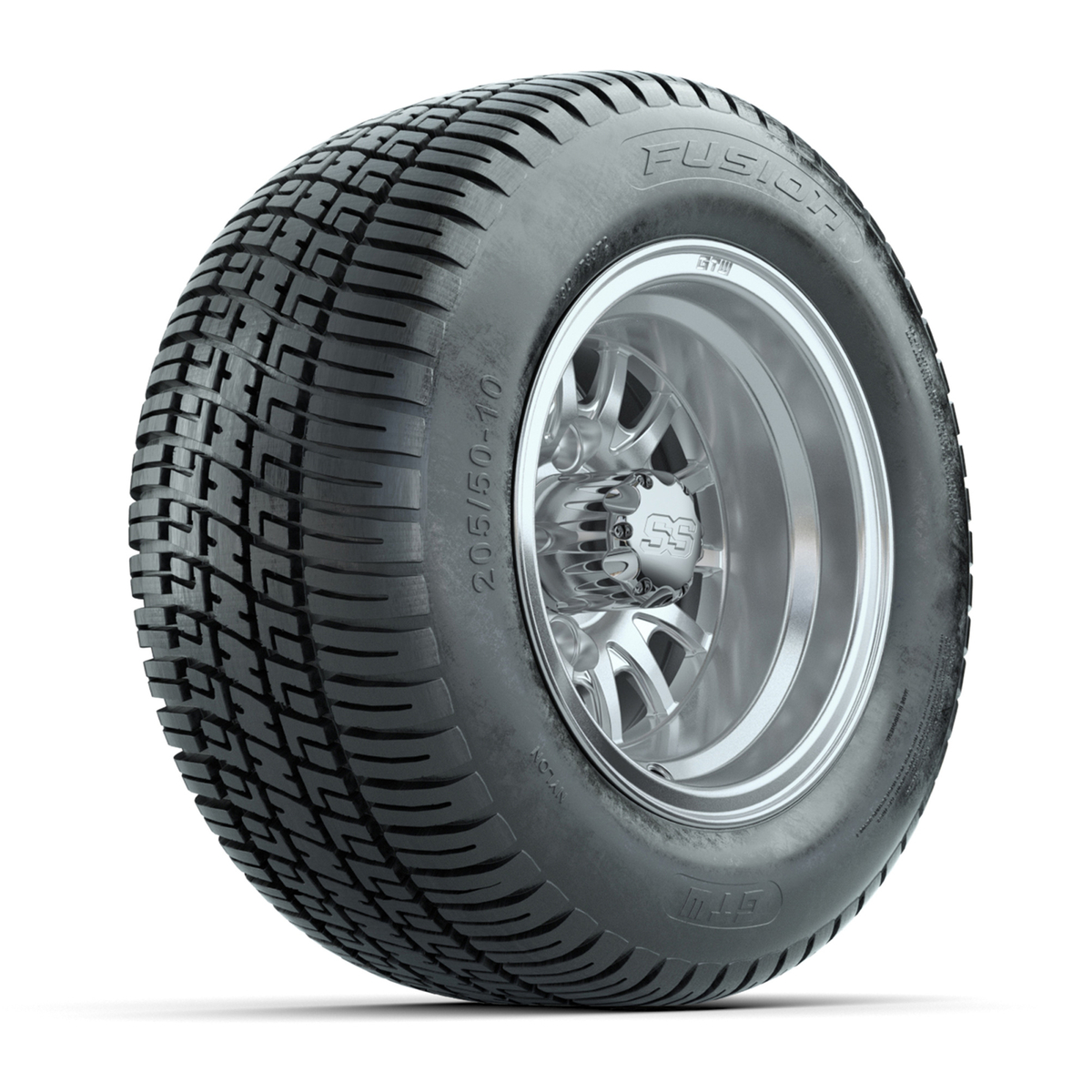 A set of (4) 10-inch Medusa silver/machined golf cart wheels on 205/50-10 (18-inch) tires