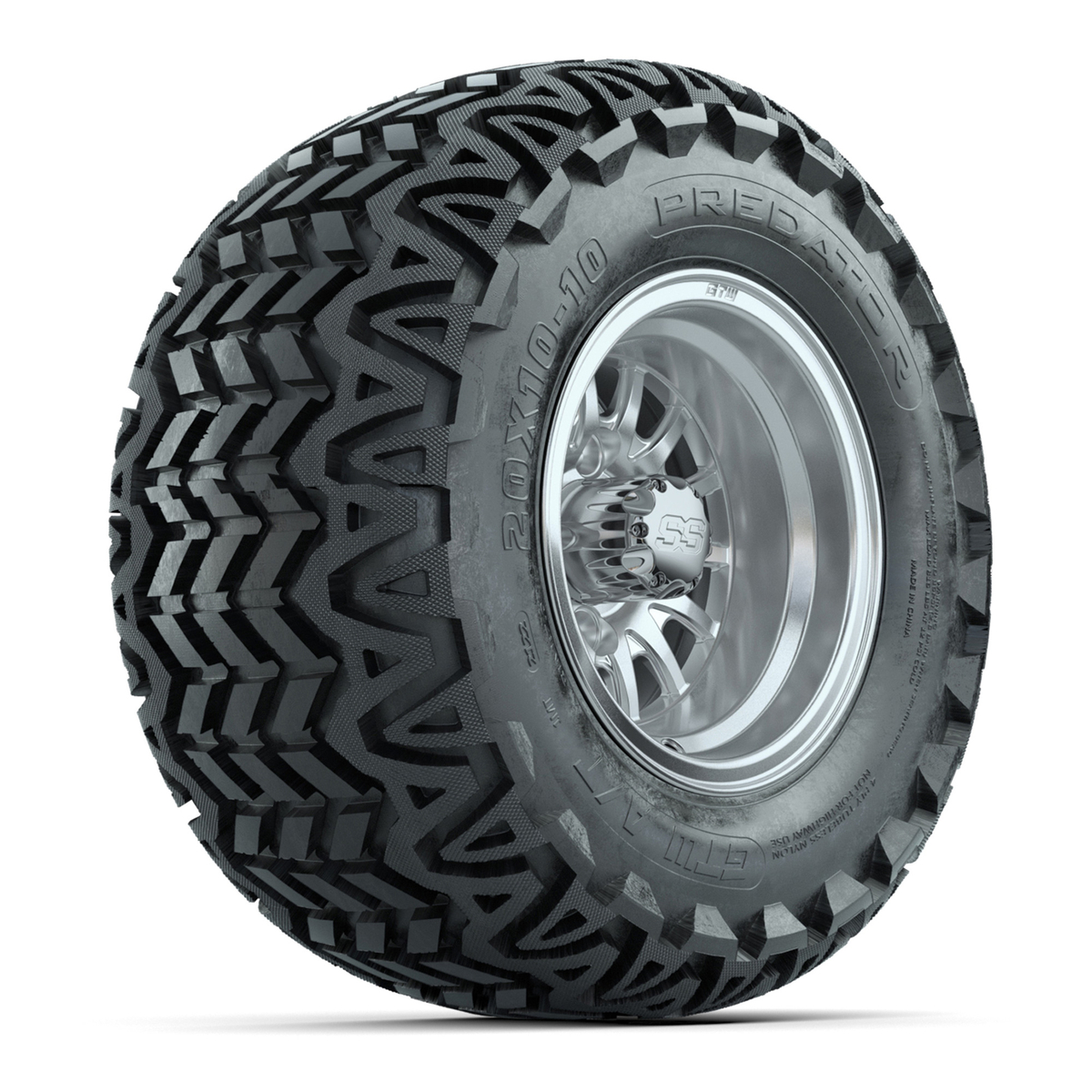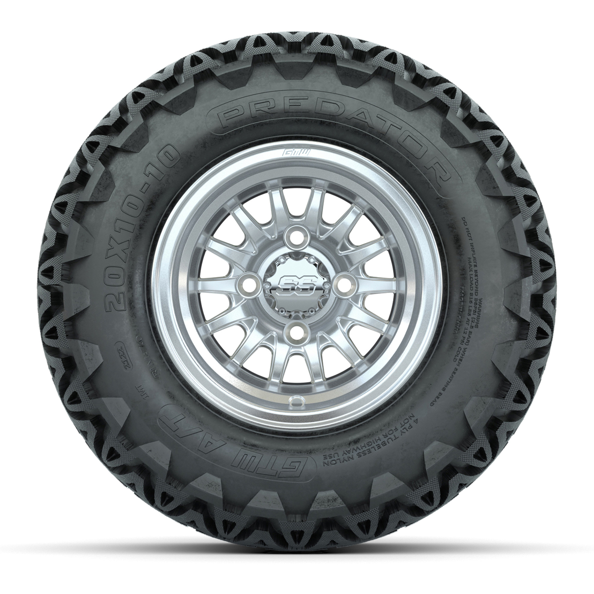 A set of (4) 10-inch Medusa silver/machined lifted golf cart wheels on 20-inch A/T tires