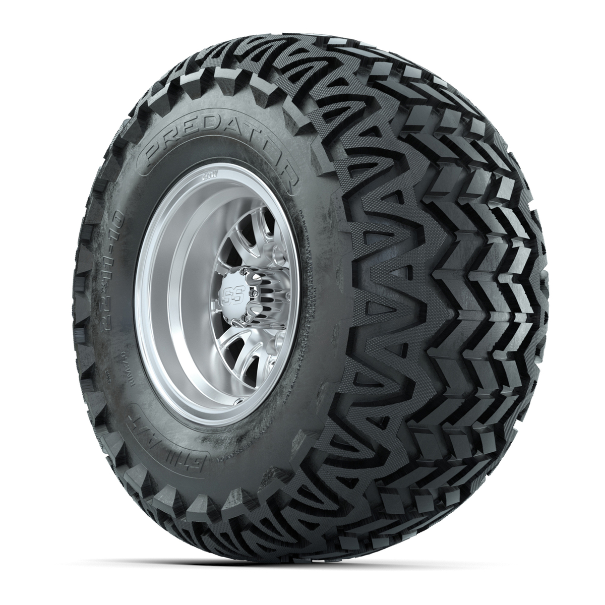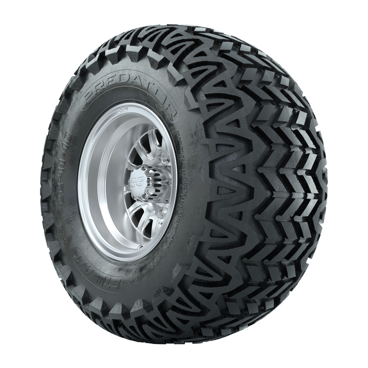 A set of (4) 10-inch Medusa silver lifted golf cart wheels on 22-inch Predator tires