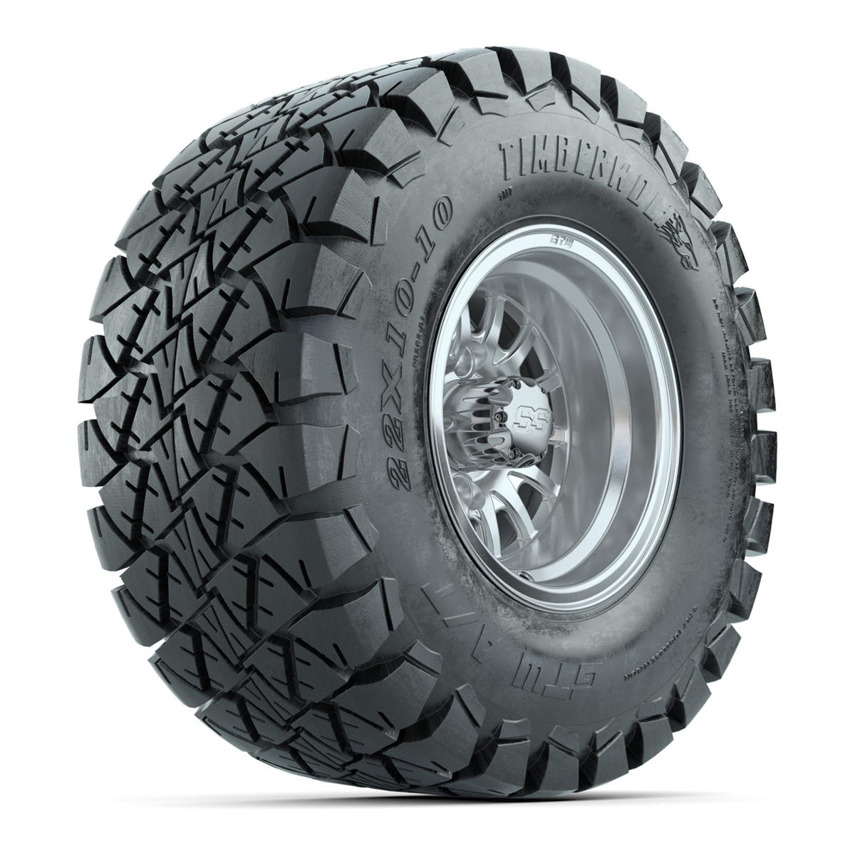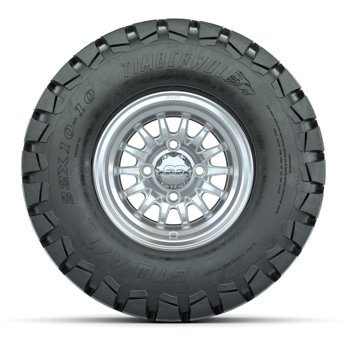 A set of (4) 10-inch Medusa silver/machined lifted golf cart wheels on 22-inch trail tires
