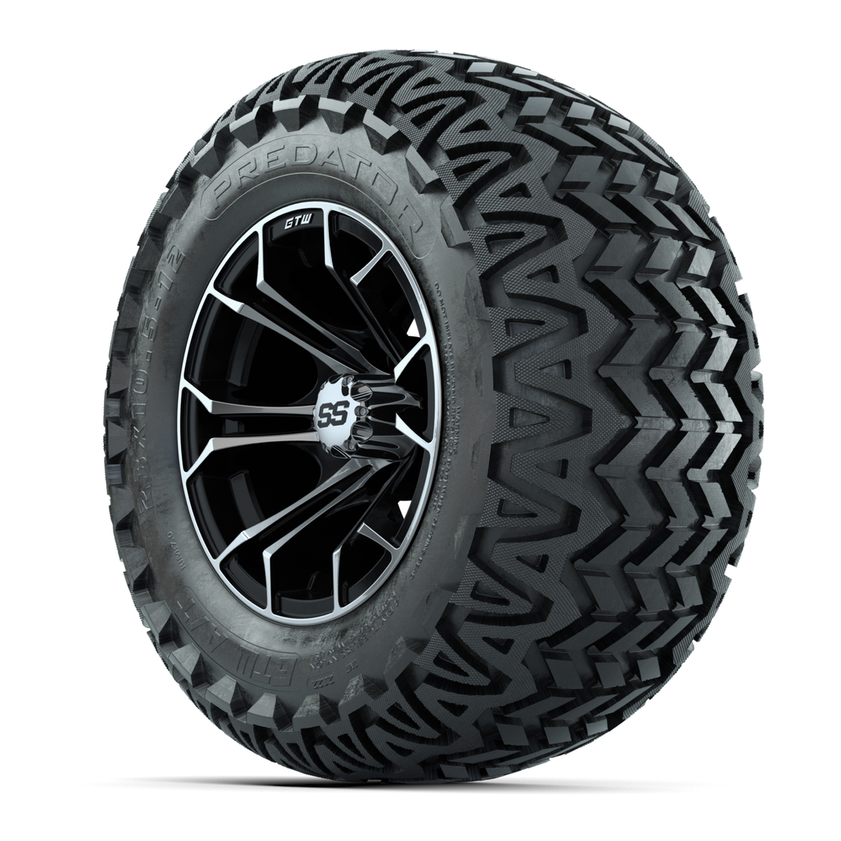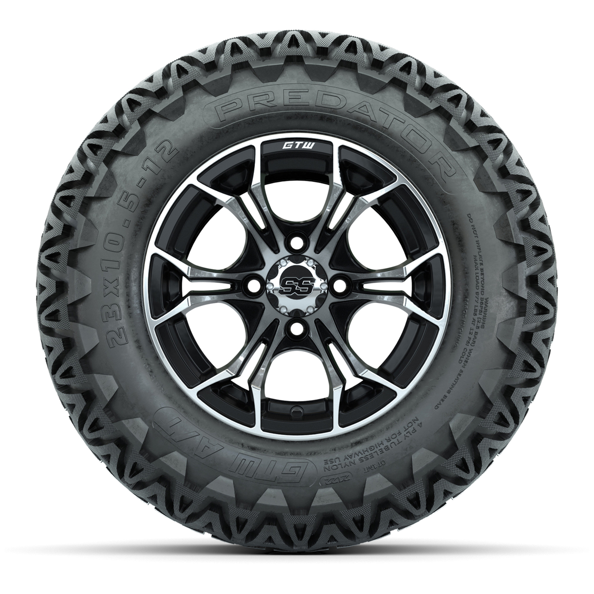 A set of (4) 12-inch Spyder black/machined lifted golf cart wheels on 23-inch A/T tires