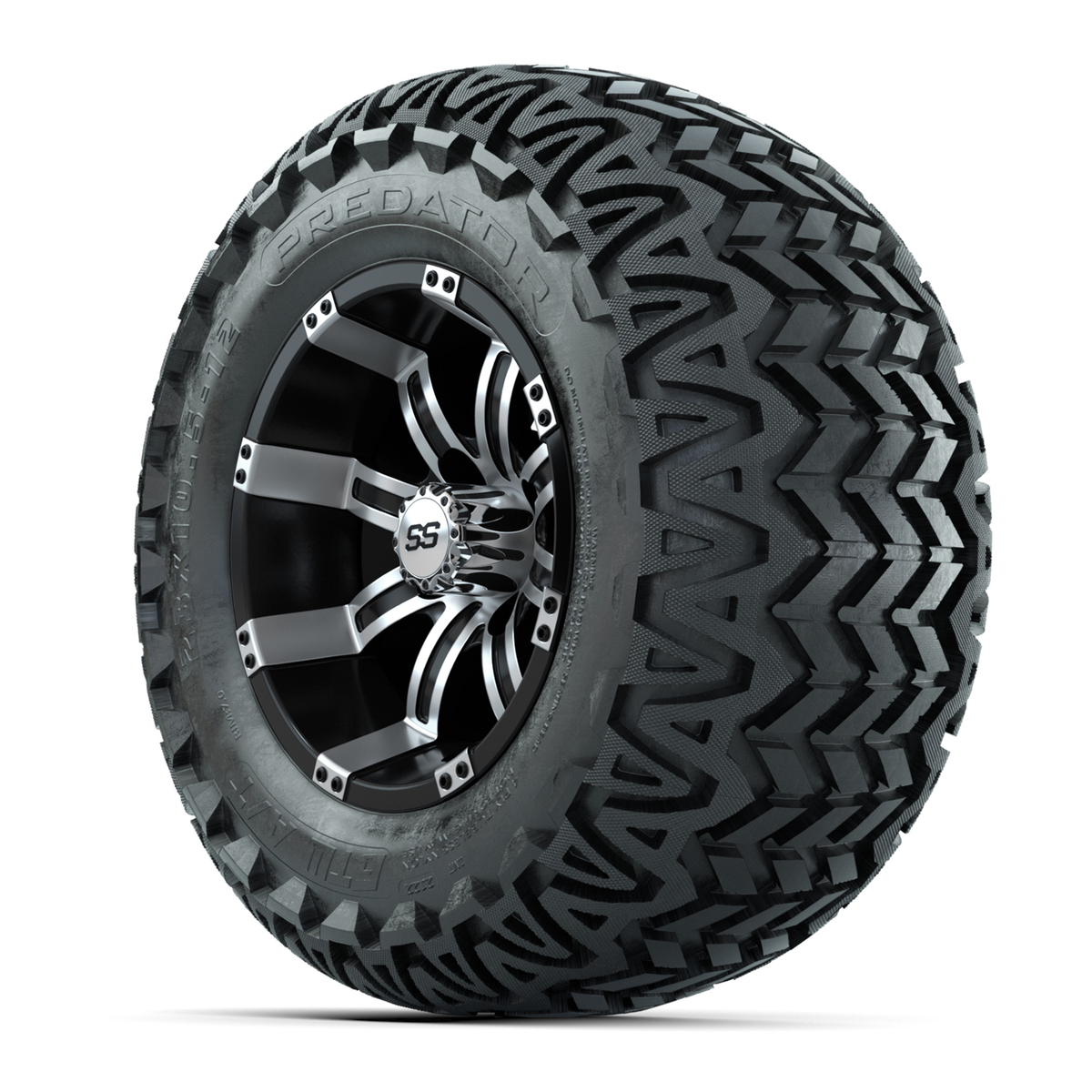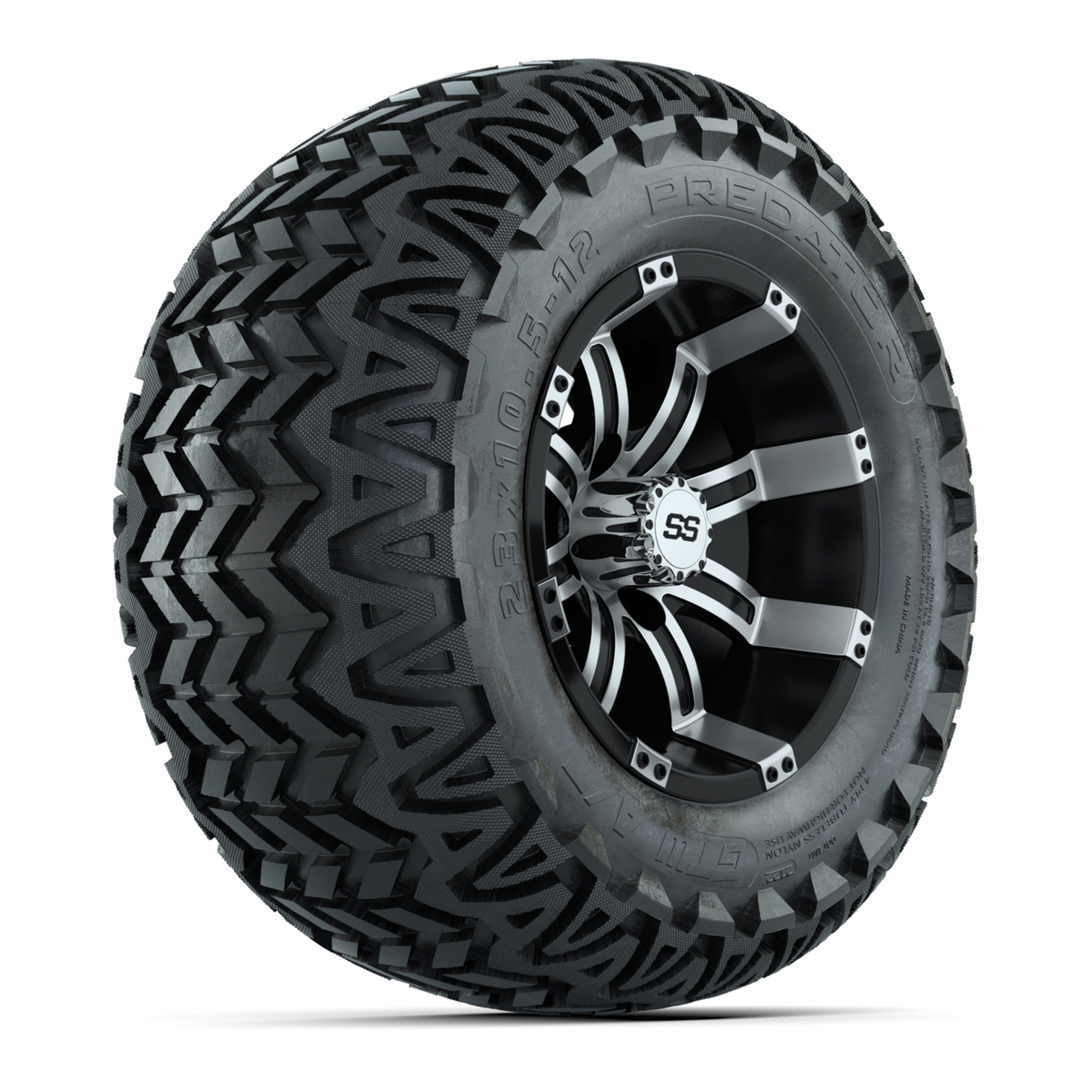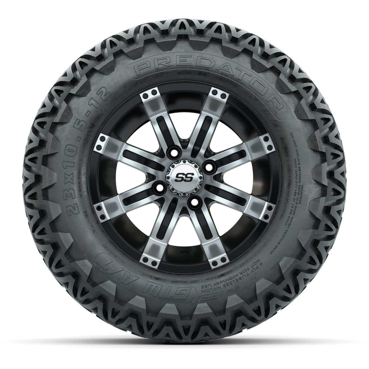 A set of (4) 12-inch Tempest black/machined lifted golf cart wheels on 23-inch A/T tires