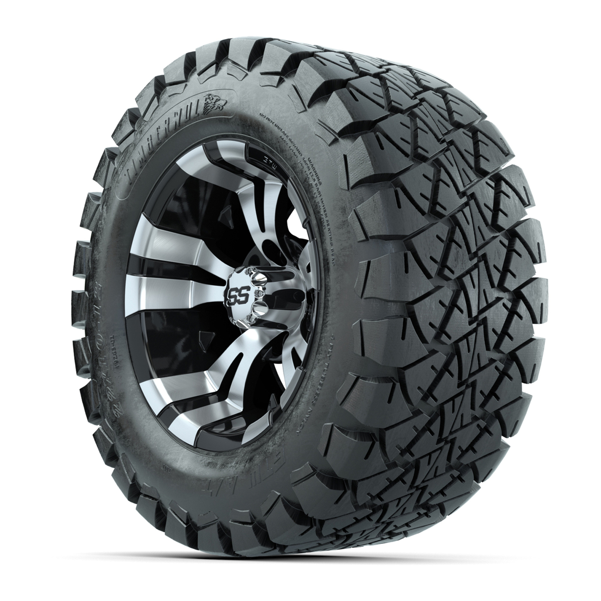 A set of (4) 12-inch Vampire black/machined lifted golf cart wheels on 22-inch trail tires