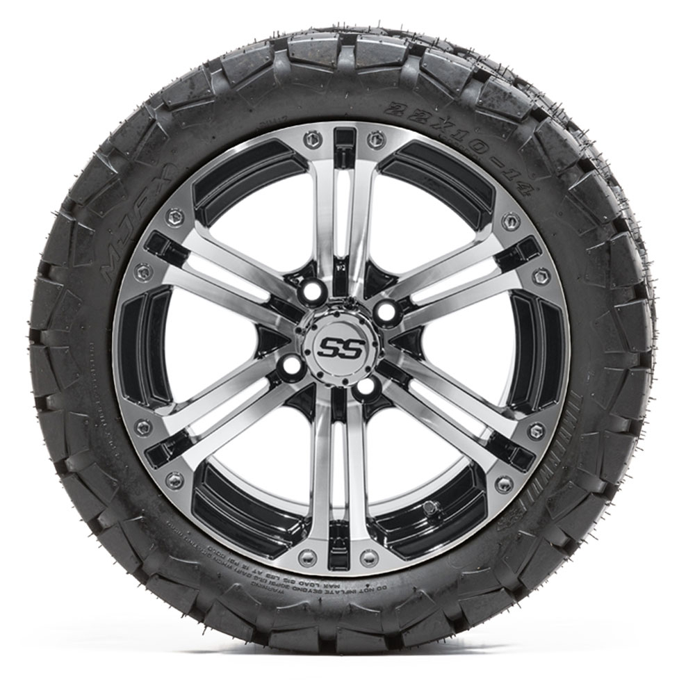 A set of (4) 14-inch Specter black/machined lifted golf cart wheels on 22-inch trail tires